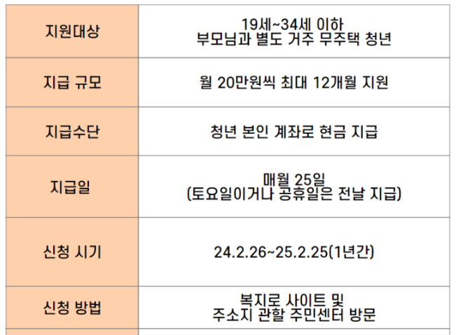 대상: 19세부터 34세까지의 청년으로, 소득 기준을 충족하고 자가 주택이 없는 자 지원 내용: 월 200,000원을 최대 12개월간 지원